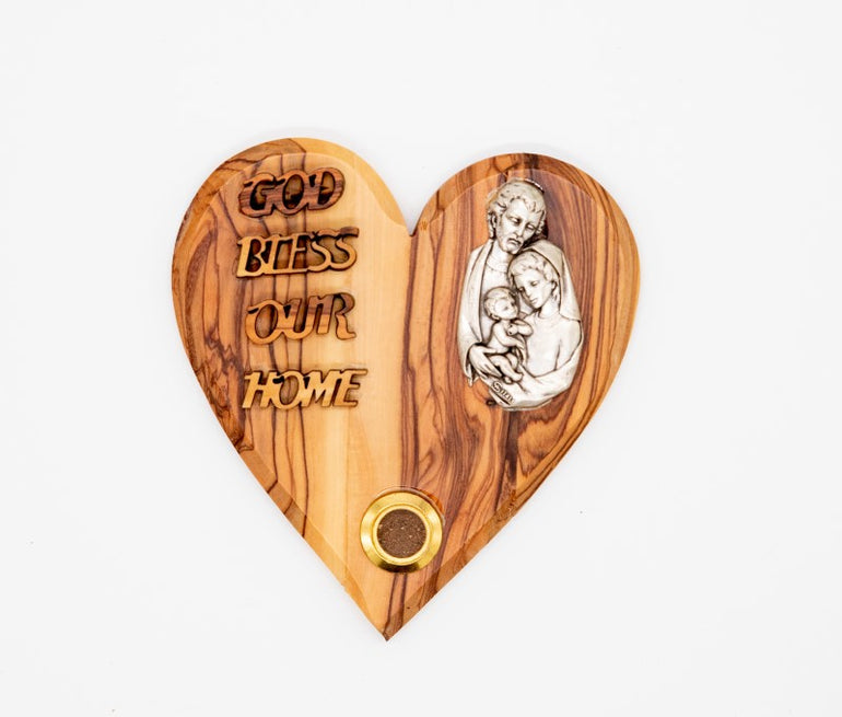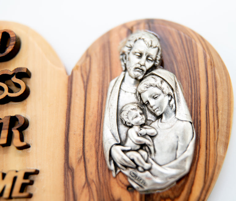God bless our home’ heart-shaped wooden plaque with metallic Holy Family icon; traditionally made and crafted, made of olive wood.