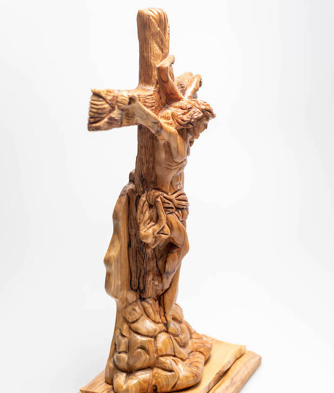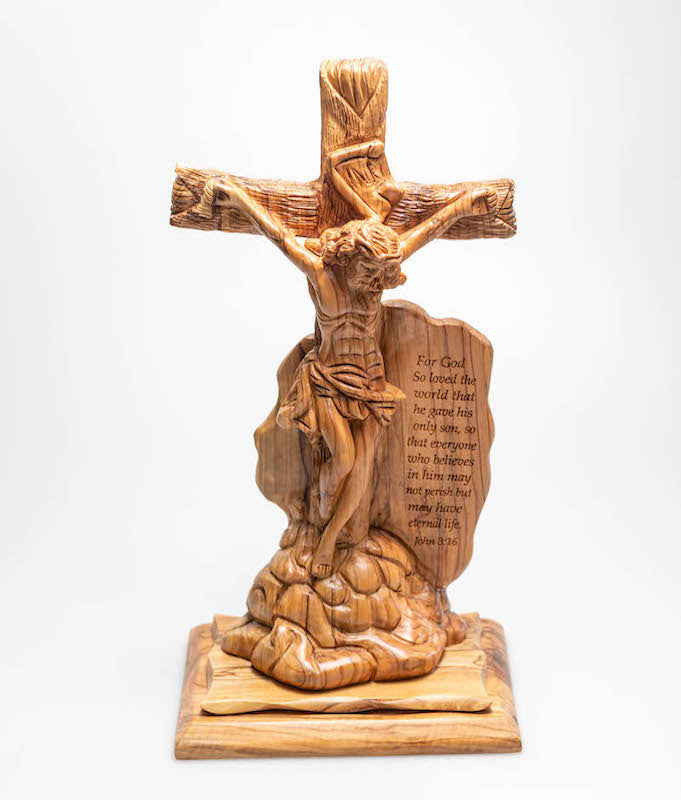 Jesus crucifixion figure, with John 3:16 scripture, traditionally made and crafted, made of olive wood.