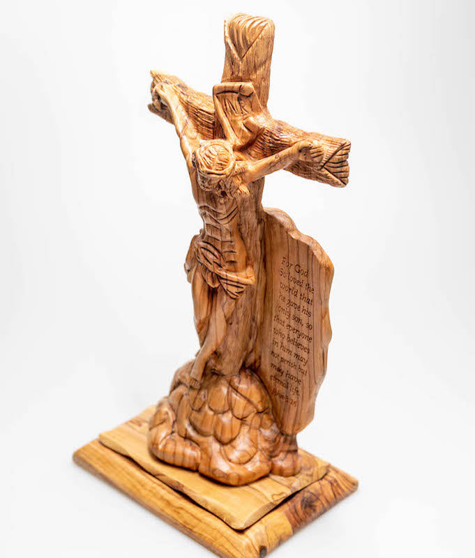 Jesus Crucifixion Figure, With John 3:16 Scripture Crafted From Olive Wood.
