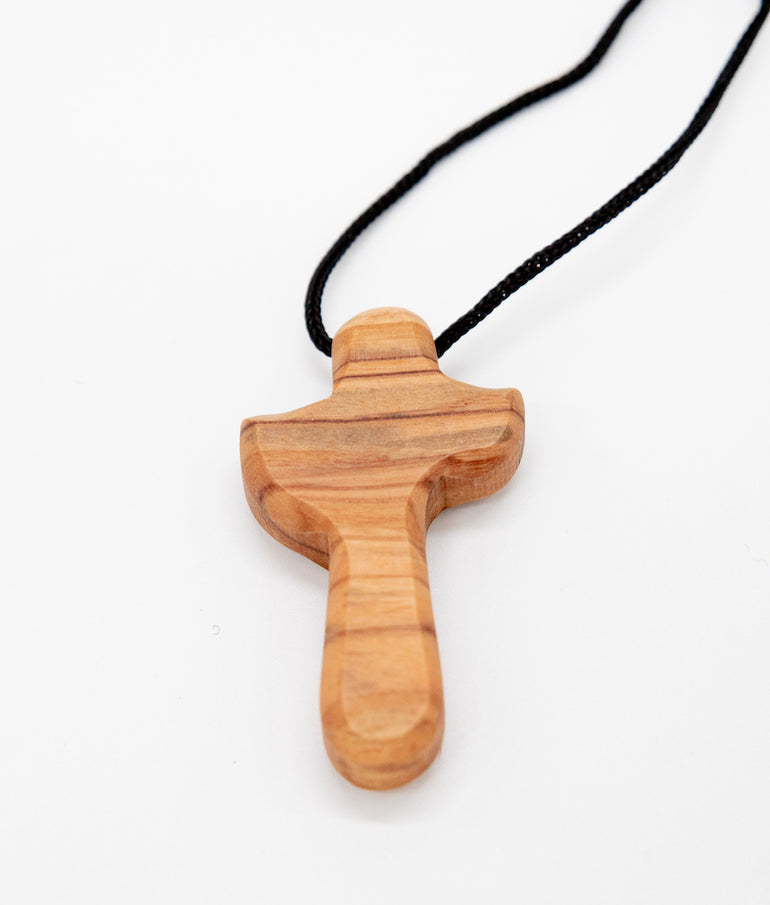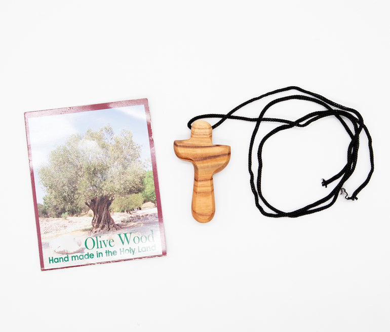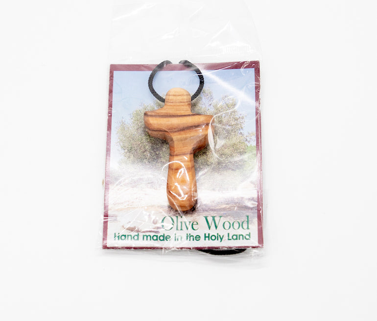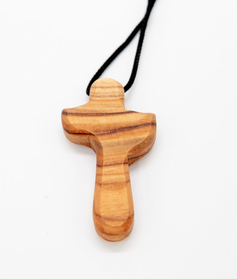 Cross with string; handcrafted in Bethlehem, birthplace of Christ. Handcrafted from pure olive wood trimmings.