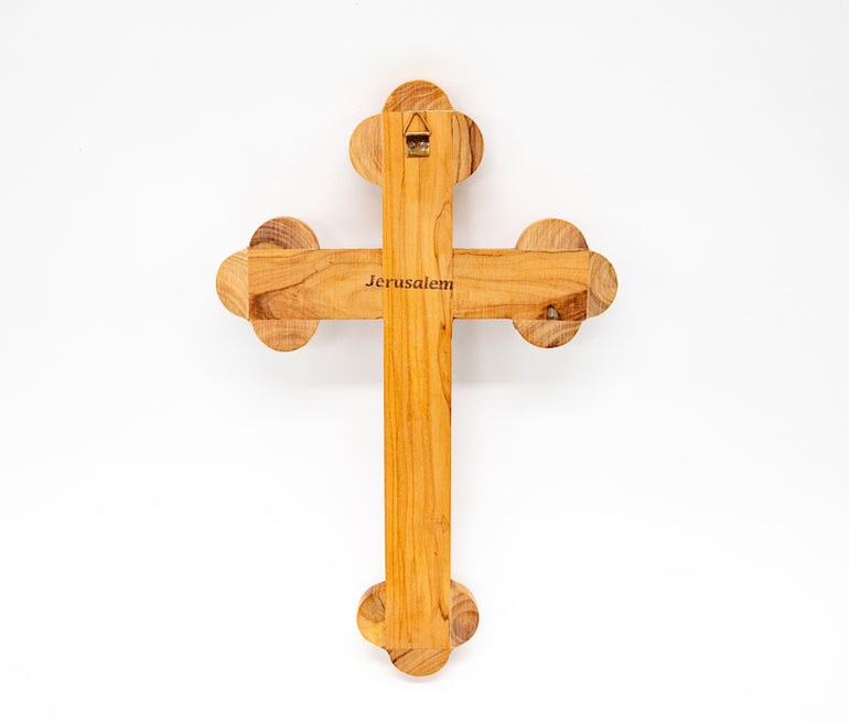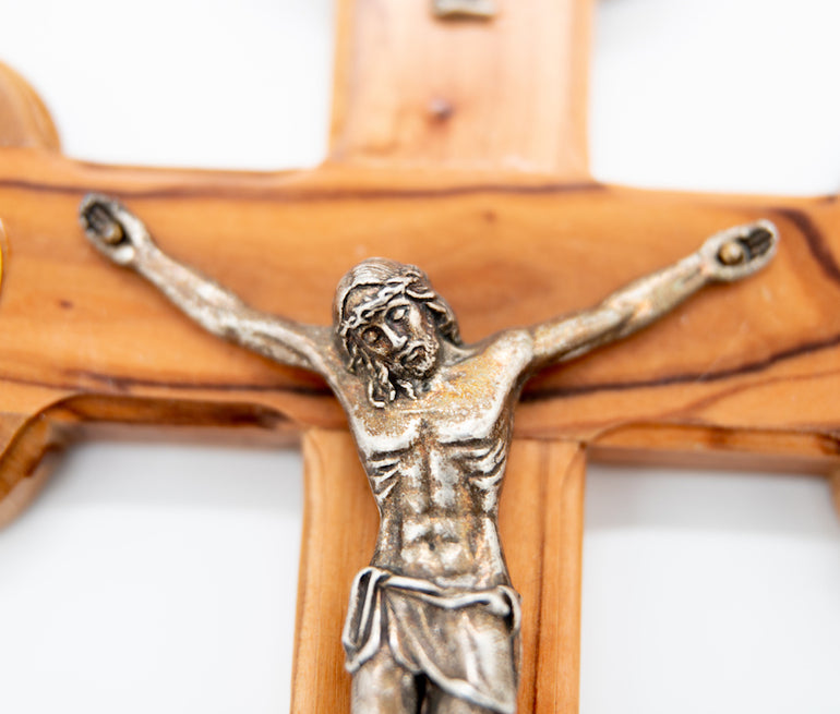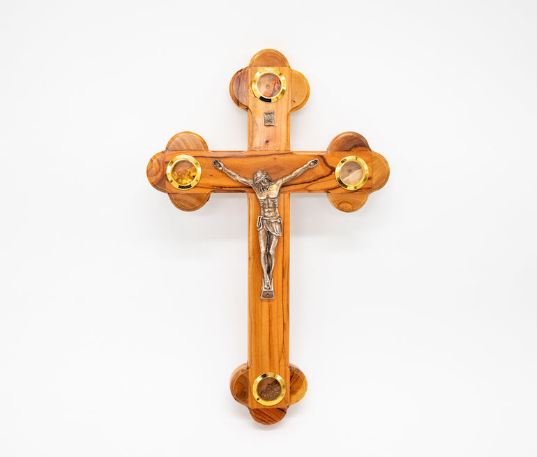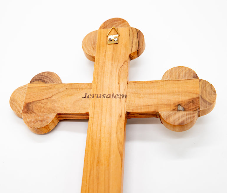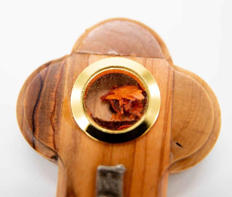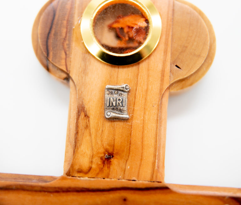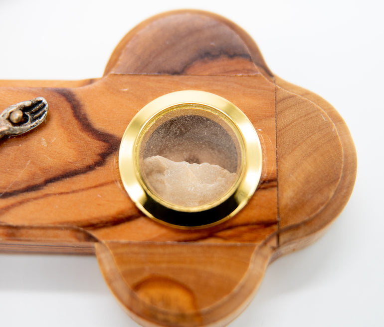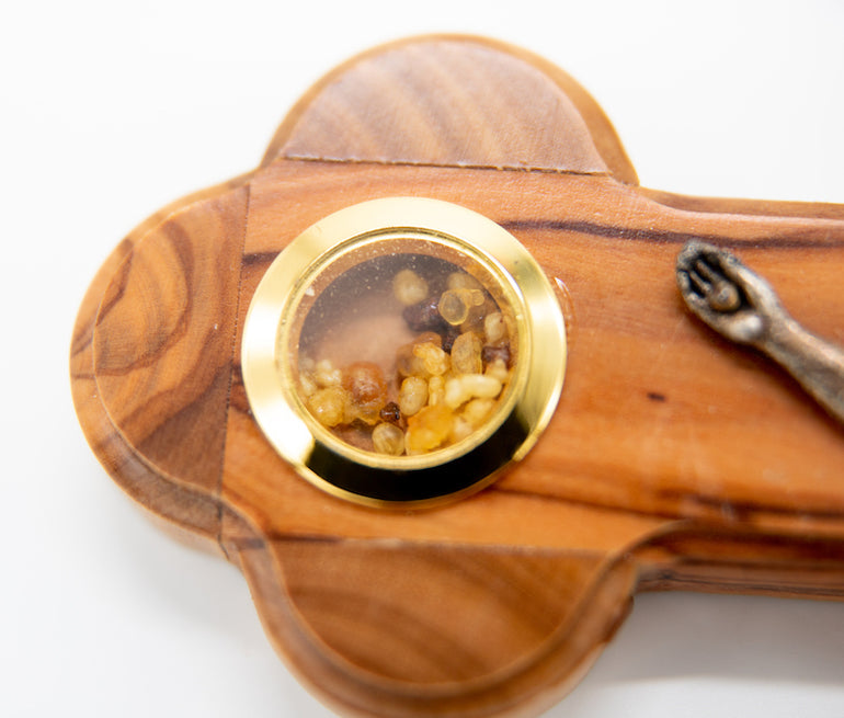 Olive wood cross with 4 essences from the Holy Land (soil, incense, flowers, Jerusalem stones); traditionally made and crafted, made of olive wood.