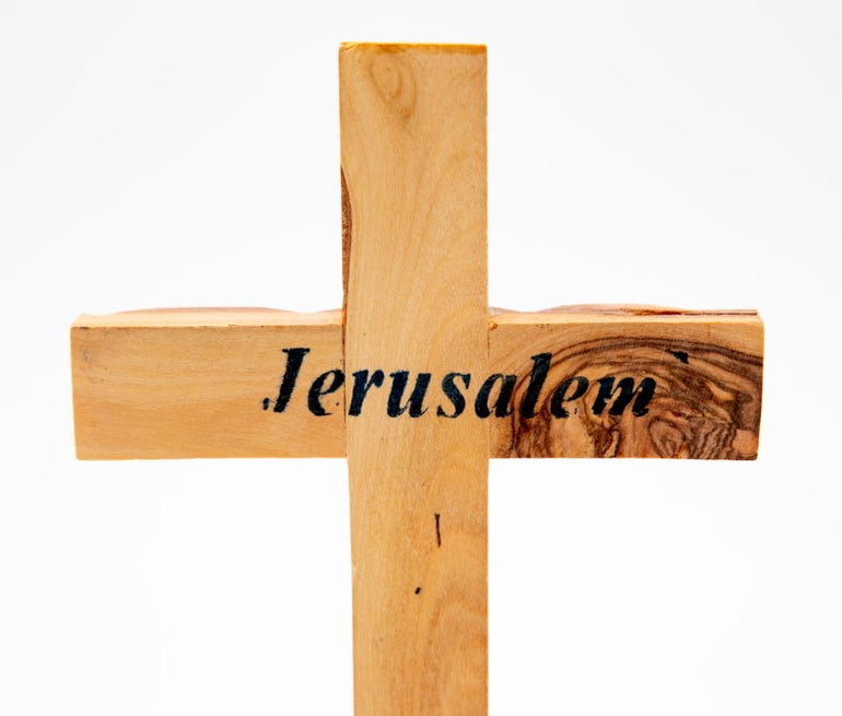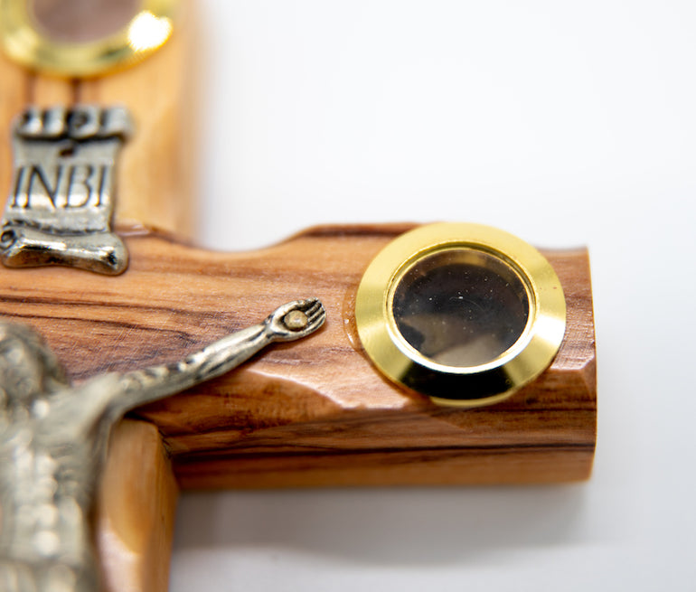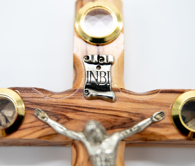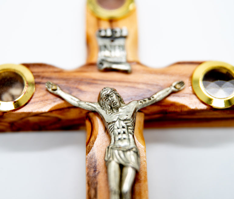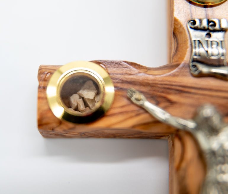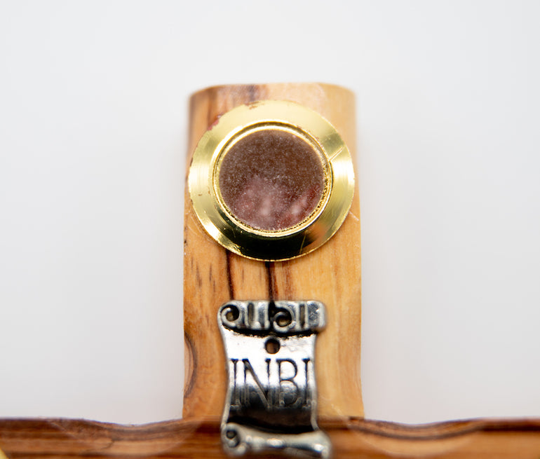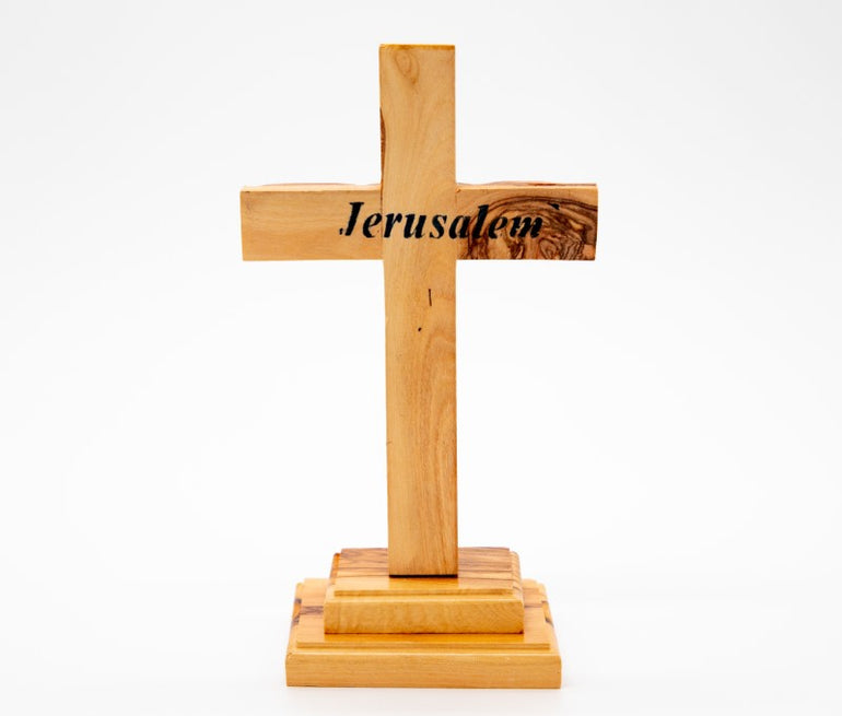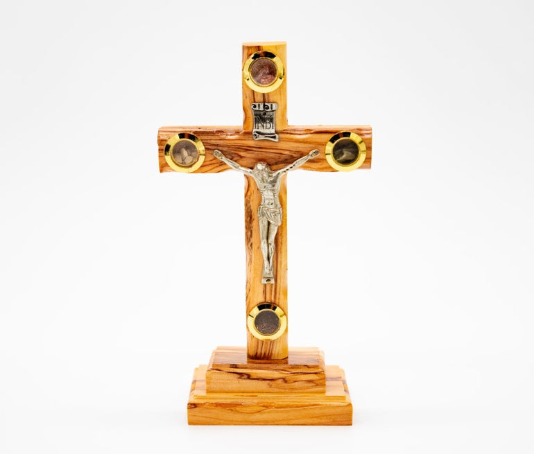 Olive wood cross with a base and 4 essences from the Holy Land (soil, incense, olive tree leaves, Jerusalem stones); traditionally made and crafted, made of olive wood.