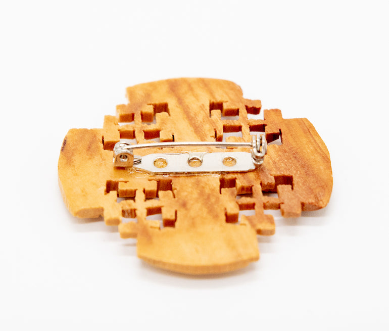 Wooden brooch; traditionally made and crafted, made of olive wood.