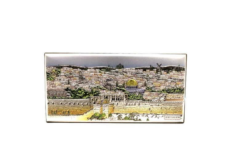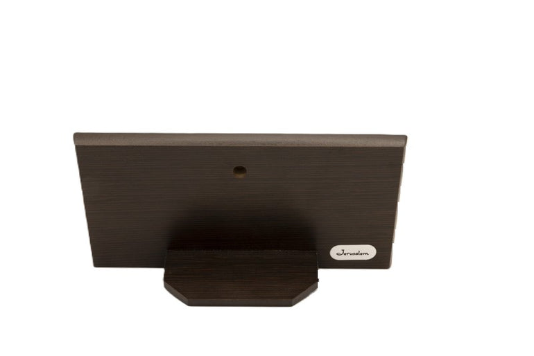 Admire the breathtaking view of Jerusalem's Old City with this beautifully crafted decor stand. The metal front and wooden back provide a sturdy and stylish display for any space. Enhance your decor with this unique piece showcasing a stunning perspective of the historic and beloved city.
