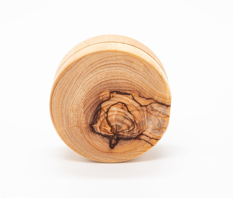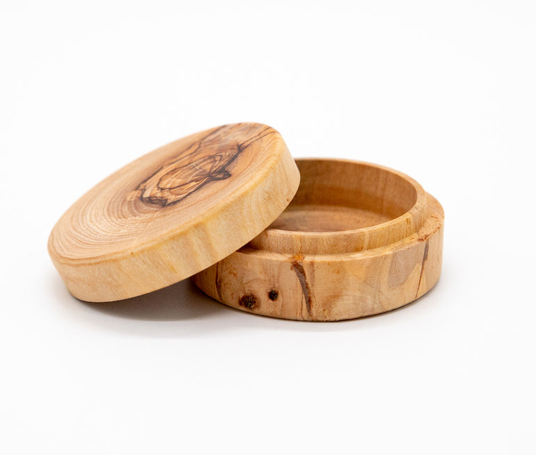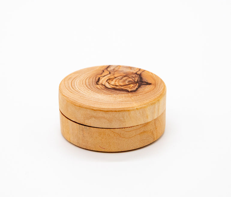 Round plain olive wood box; traditionally made and crafted, made of olive wood.