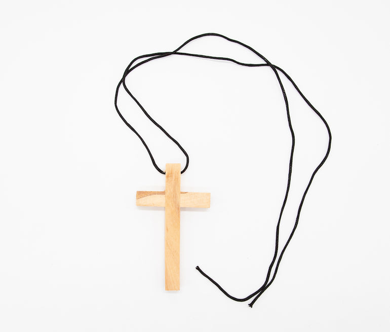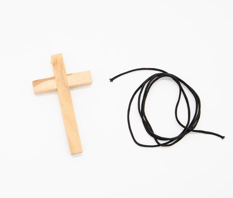 Cross with string; handmade in Bethlehem, birthplace of Christ. Handcrafted from pure olive wood trimmings.