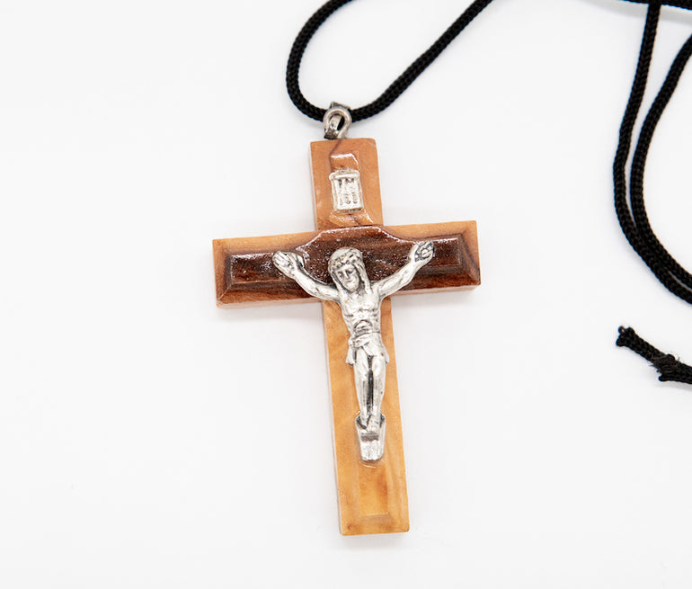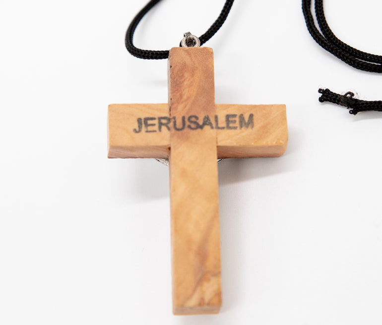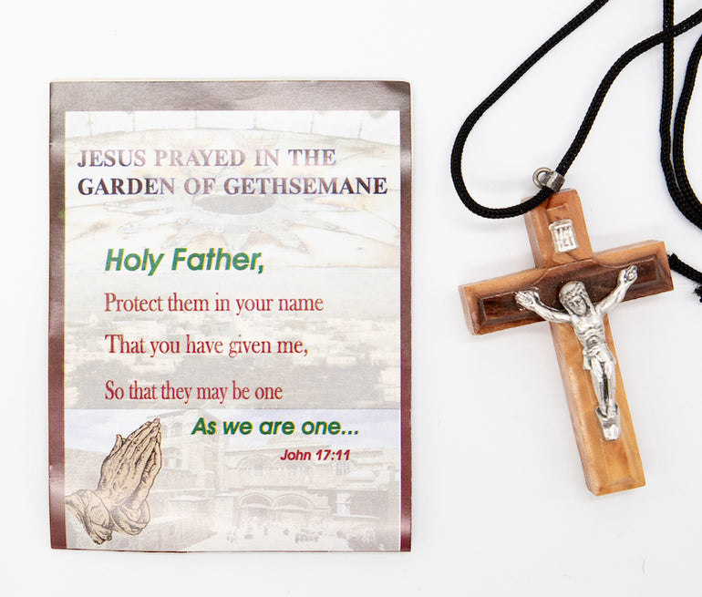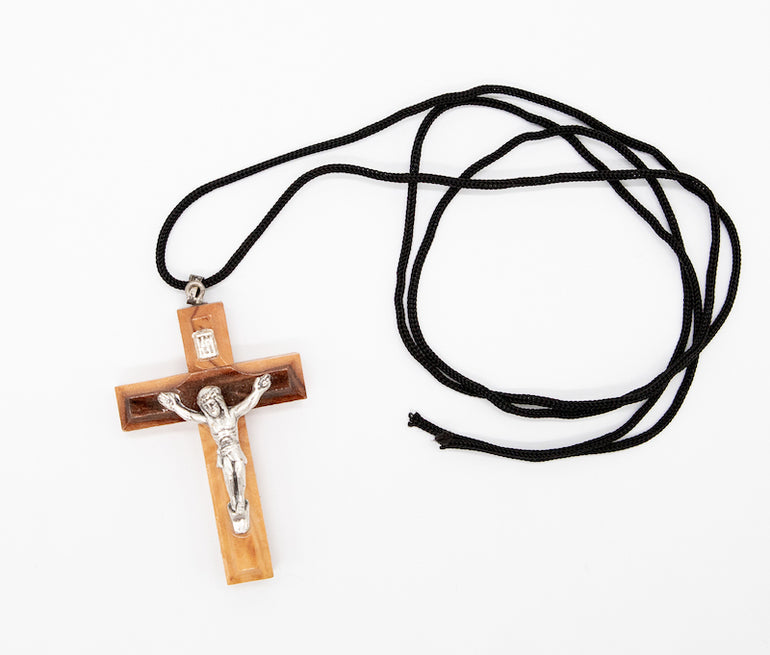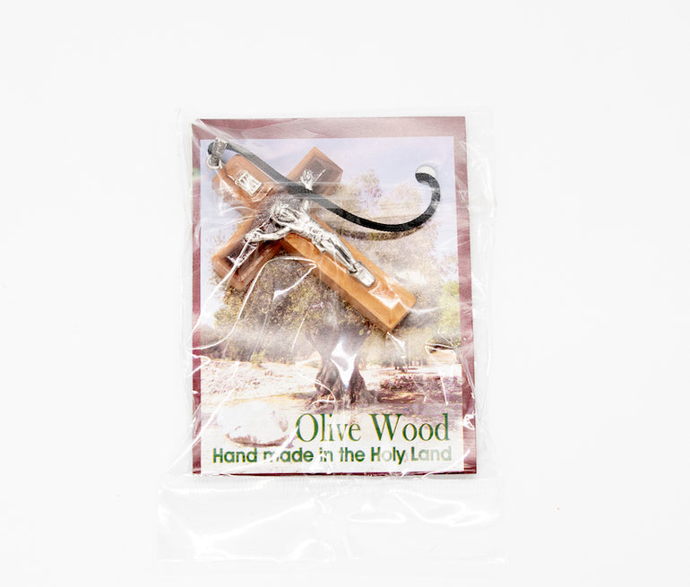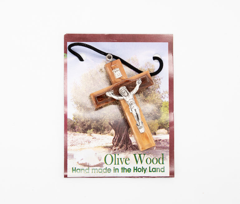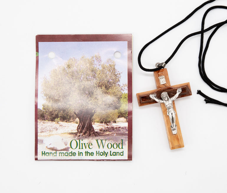 Cross with string with crucifix; handmade in Bethlehem, birthplace of Christ. Handcrafted from pure olive wood trimmings.