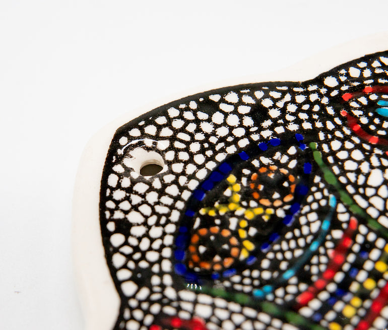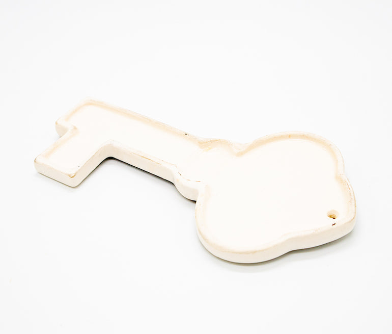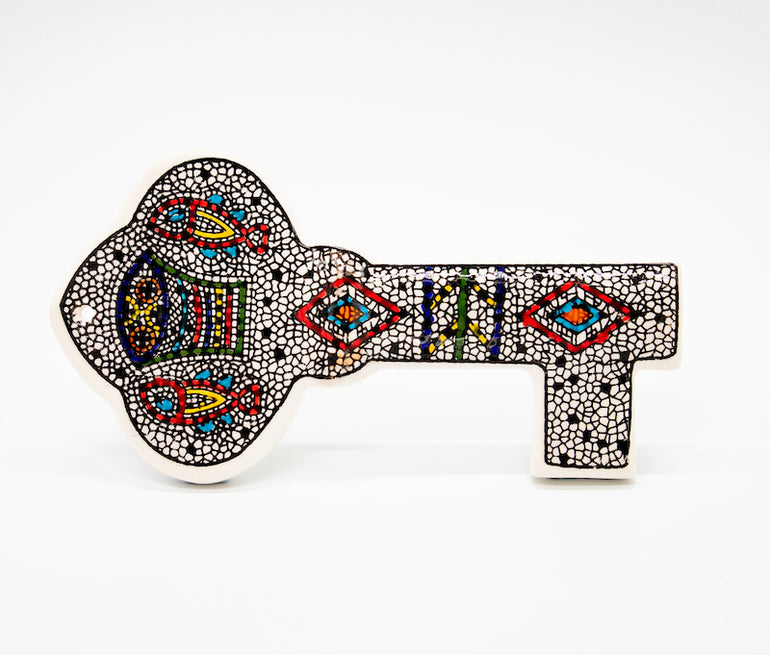 Ceramic decorative key-shaped plaque with loaves & fishes image, resembling the fish and loaves miracle.