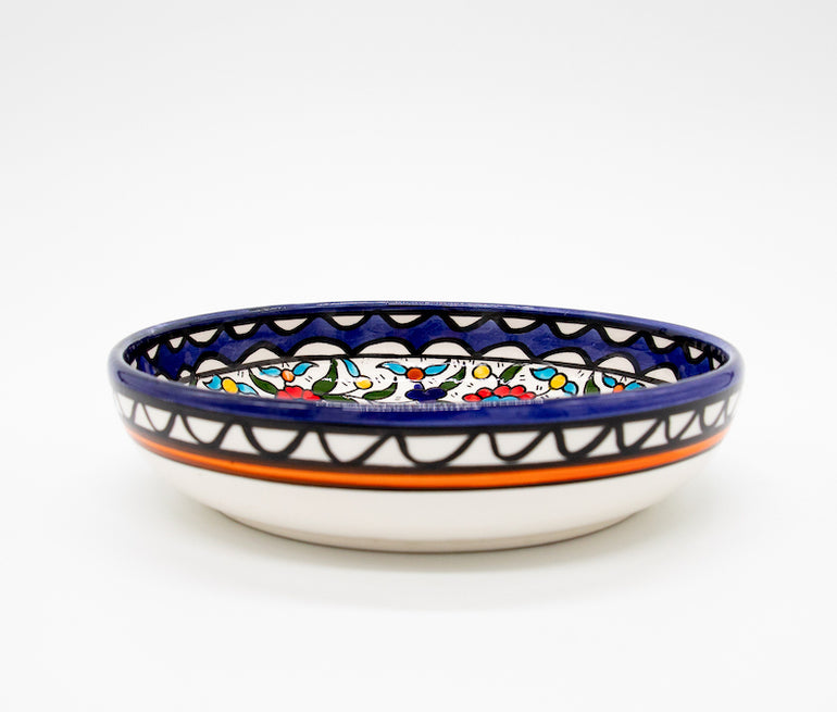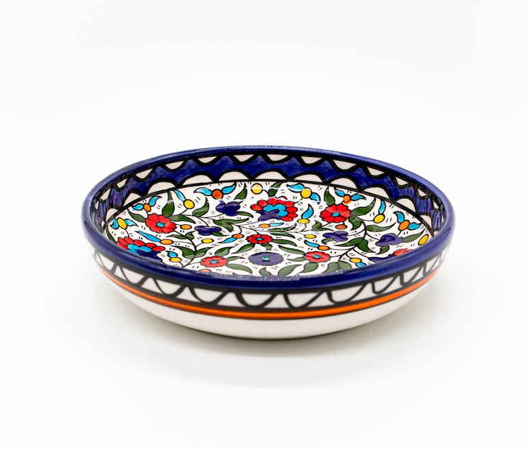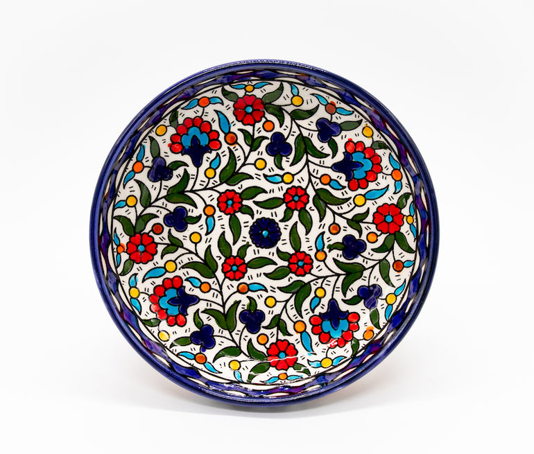 Round ceramic bowl with floral patterns; colorful red flowers.