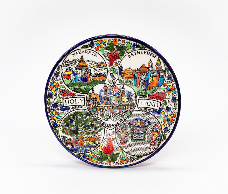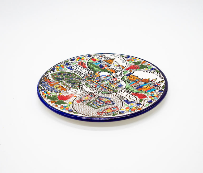 Decorative plaque with images from the Holy Land; resembling the cities of Nazareth, Bethlehem, and Jerusalem, in addition to the loaves and fish miracle, and the tree of life mosaic in Jericho.