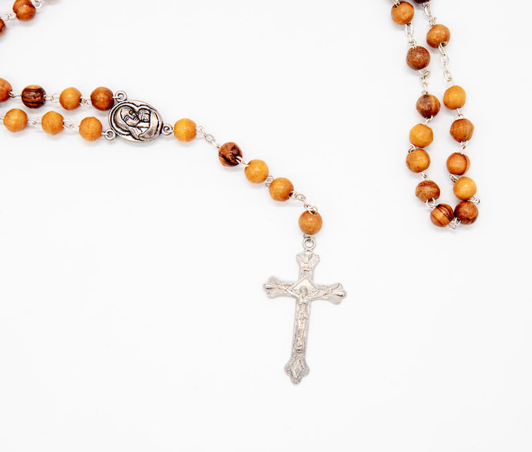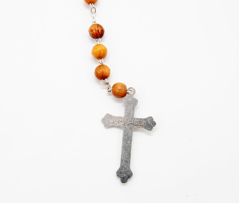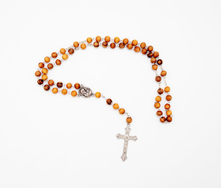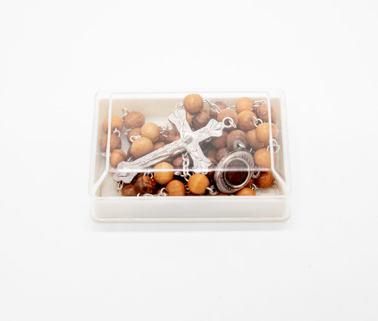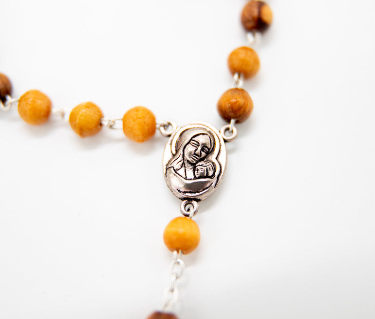 Wooden rosary with Jerusalem soil and Virgin Mary with baby Jesus; traditionally made in Bethlehem, birthplace of Christ.