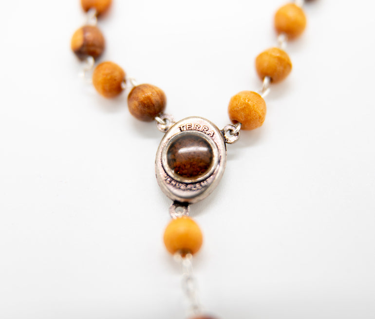 Wooden rosary with Jerusalem soil and Virgin Mary with baby Jesus